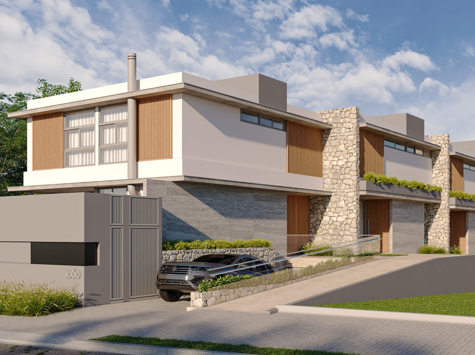 Optamos pela proposta de uso de habitação unifamiliar em serie, orientada transversalmente ao alinhamento predial, incorporando subsolo e acesso de pedestres comum. Esta abordagem viabilizou projetar quatro residências, com áreas variando entre 130m2 e 150m2, cada uma composta por 3 suítes e 2 vagas de garagem.